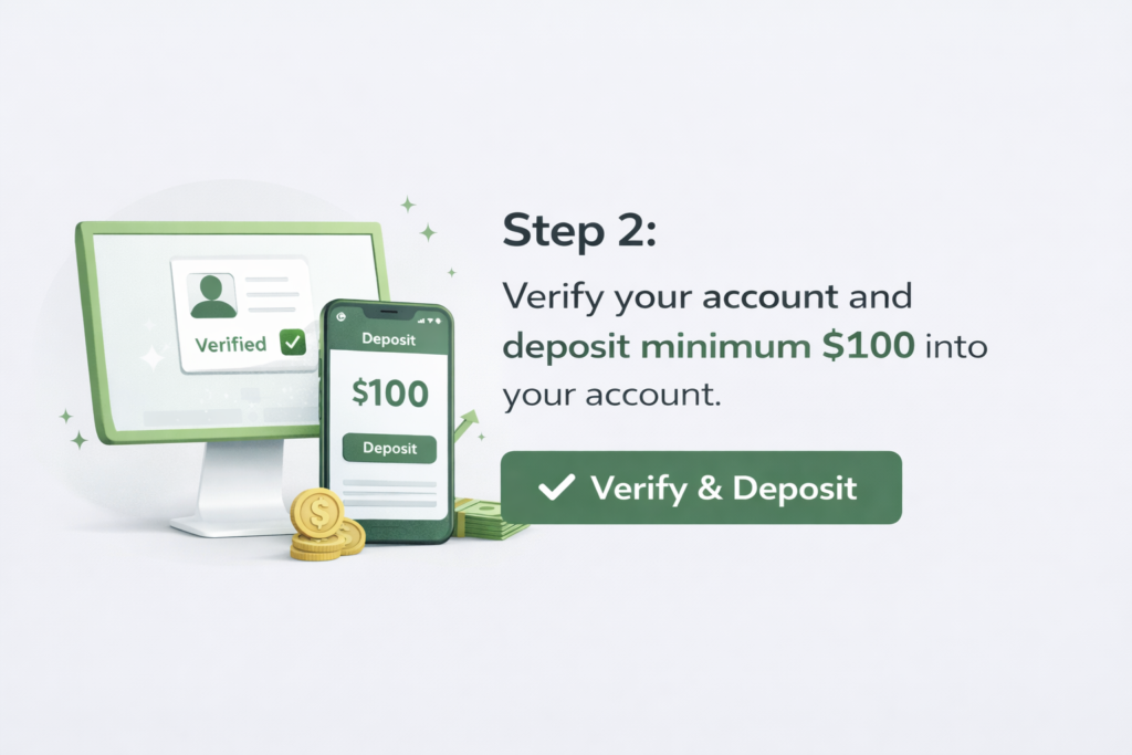 অ্যাকাউন্ট তৈরি করার পর আপনার ট্রেডিং অ্যাকাউন্টটি ভেরিফাই করুন এবং ন্যূনতম $100 ডিপোজিট করুন। ভেরিফিকেশন সম্পন্ন হলে আপনি নিরাপদভাবে ট্রেডিং প্ল্যাটফর্ম ব্যবহার করতে পারবেন এবং লাইভ মার্কেটে ট্রেডিং শুরু করার জন্য প্রস্তুত হয়ে যাবেন।